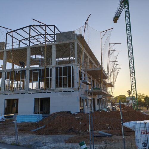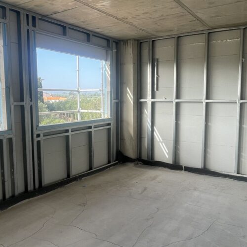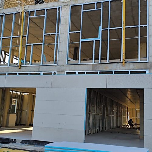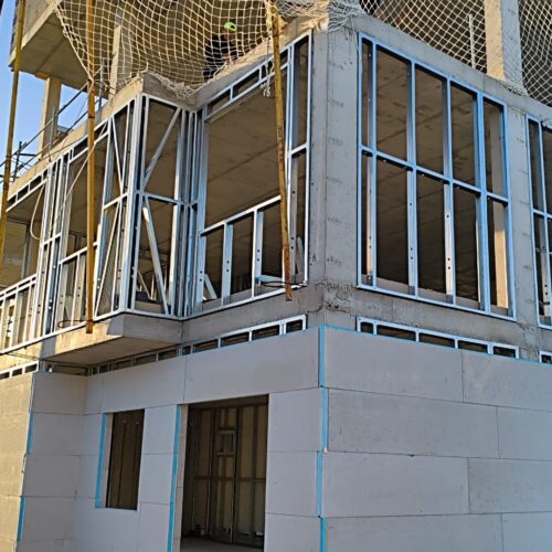 En este proyecto hemos intervenido como estructura secundaria, desarrollando los bastidores de cerramiento de fachada del edificio mediante sistema industrializado. Una decisión técnica que cambia por completo la dinámica de obra.