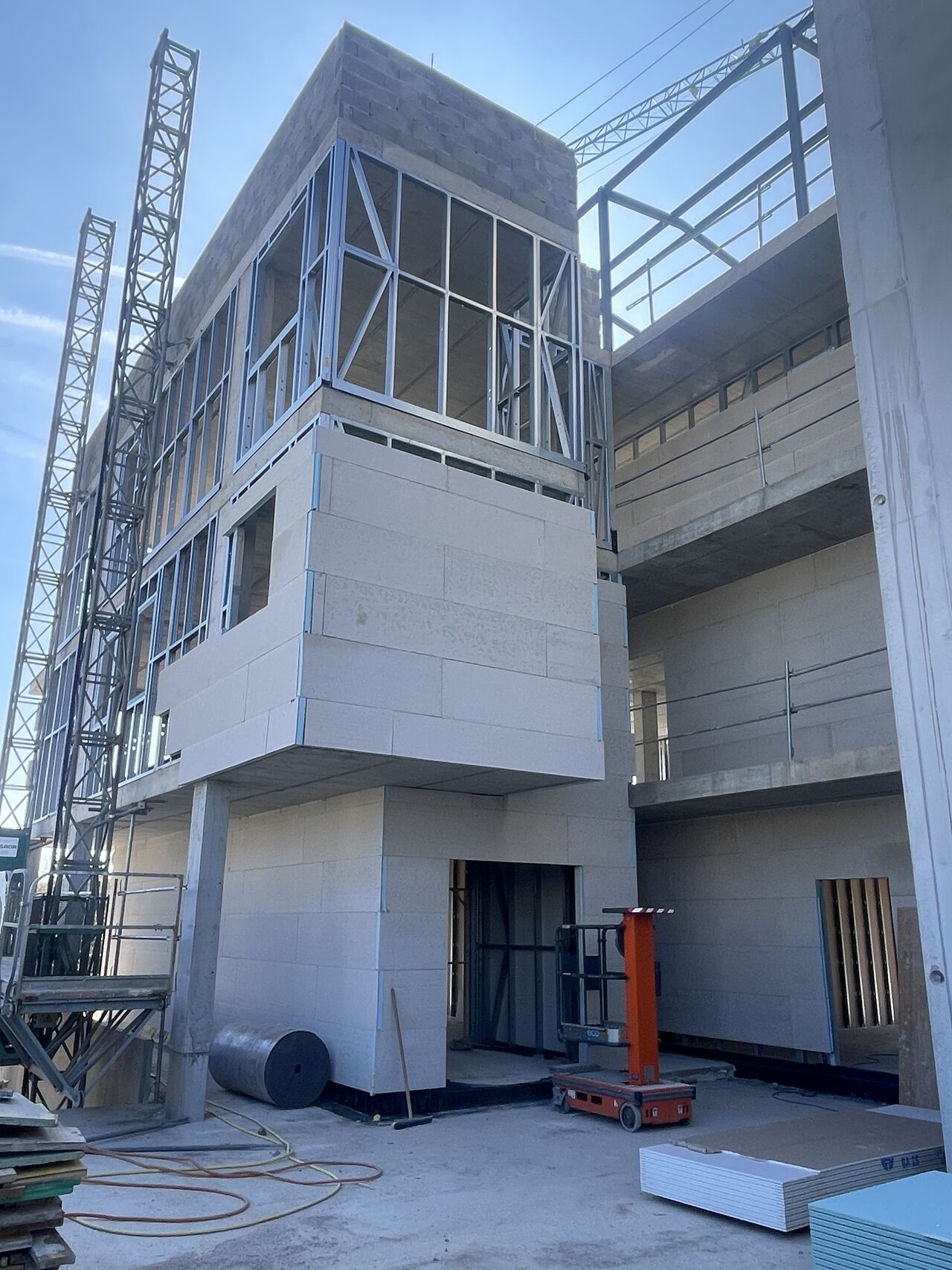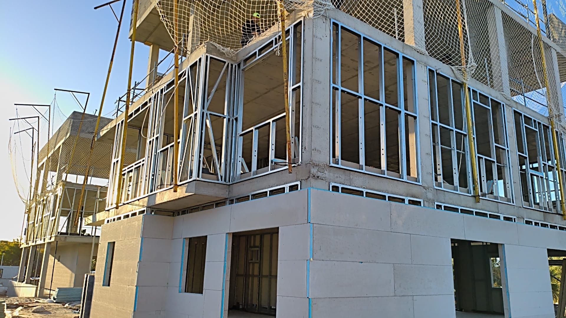 En este proyecto hemos intervenido como estructura secundaria, desarrollando los bastidores de cerramiento de fachada del edificio mediante sistema industrializado. Una decisión técnica que cambia por completo la dinámica de obra.